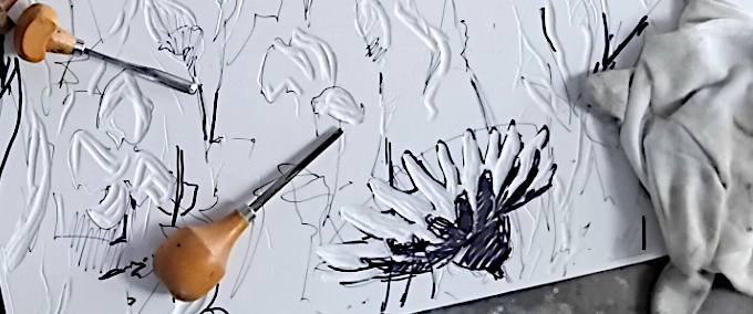 | January - March 2026Every now and then over the past couple of months I've been working on a relief print. The idea for the image has come from a series of field drawings and colour sketches gathered last May on Massingham Heath in NW Norfolk.
