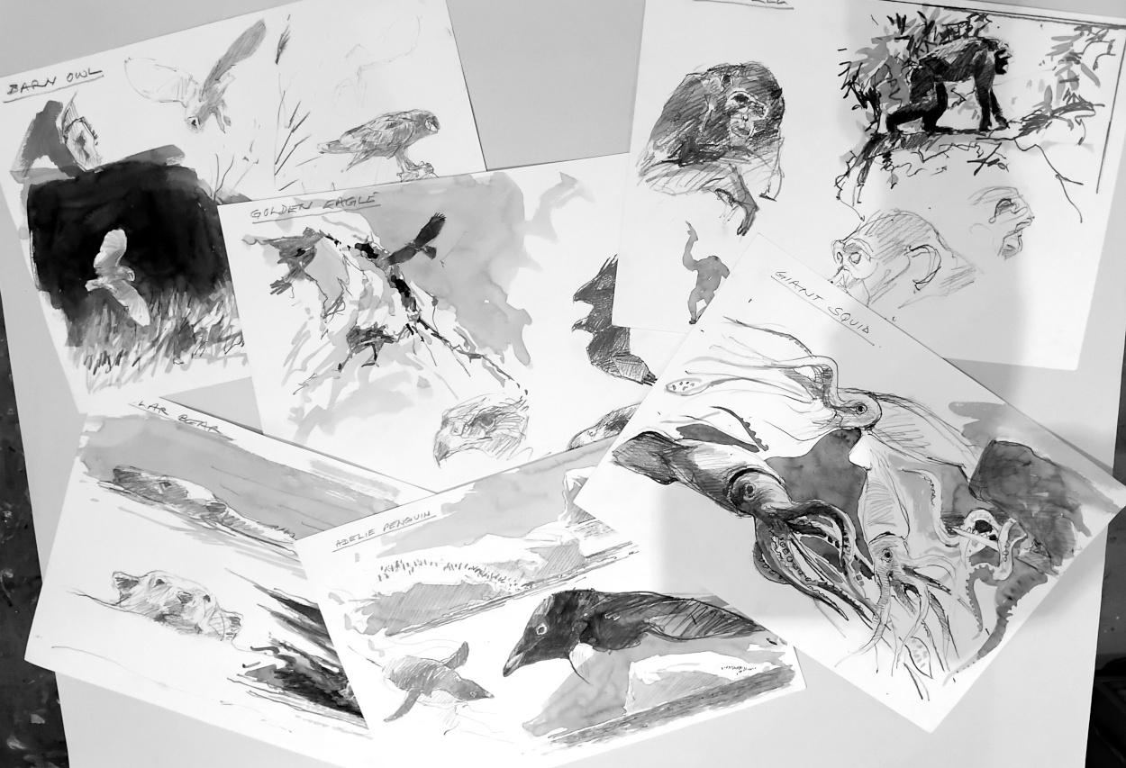January - July 2026Another project in the studio is working on a series of black & white illustrations for a new book by acclaimed wildlife filmmaker Alastair Fothergill. A Natural Selection is a "love letter to life in its wildest forms" which explores Alastair’s career, behind-the-scenes stories of filming 10 specific animals, and the urgent environmental changes threatening them. |